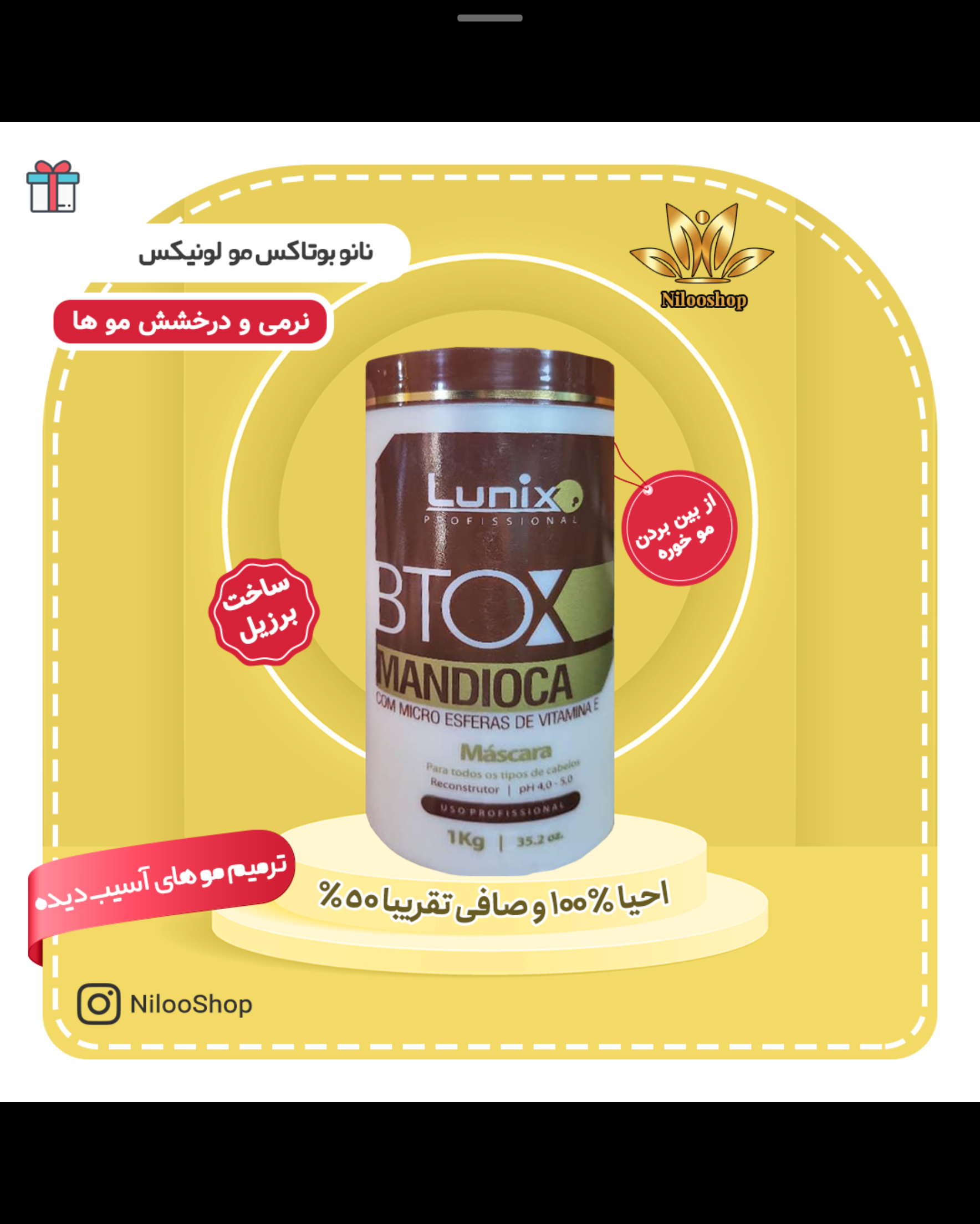 ویژگی های محصول بوتاکس لونیکس محصول کشور: برزیل صافی: %۶۰ احیا: %۱۰۰ بدون بو و گاز مناسب انواع مو مخصوصا موی آسیب دیده و دکلره شده نرمی و ابریشمی شدن بی نظیر موها هیدراتاسیون قوی(آبرسانی) درمان سوختگی شیمیایی و حرارتی